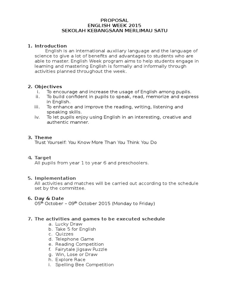 . Presentation letterIn this proposal we will be presenting how will we approach the 7th 8th and 9th grade by making a full week of activities related to the English week theme. Di dalam menghadapi cabaran globalisasi penguasaan Bahasa Inggeris amat. 22 september hingga 26 september 2014 bertempat.